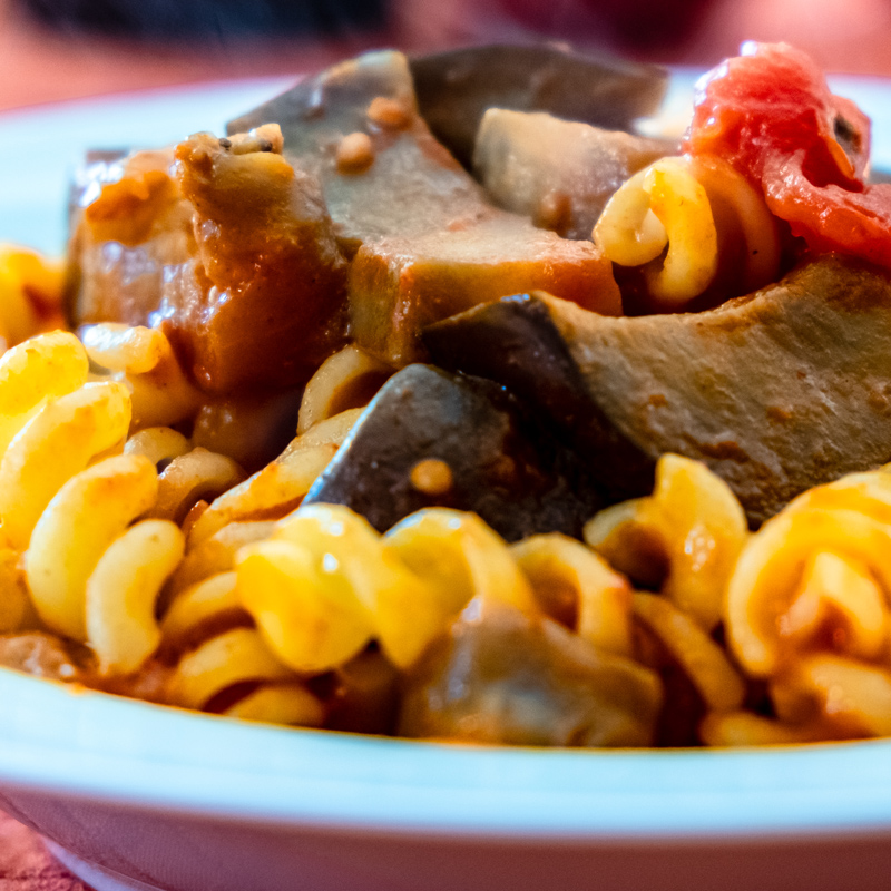 • Pasta e Ceci alla norma (Sardinian fried pasta, chickpeas, tomatoes, greens, eggplant) *Blue Zones Inspired