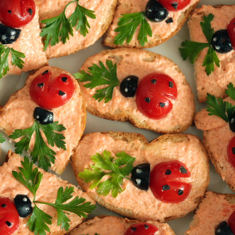 • Ladybug Caprese Bites – Toast with Homemade Pesto, Mozzarella, Basil, Tomatoes and Olives Sliced to Look Like Ladybugs!